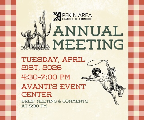The Pekin Area Chamber of Commerce invites you to join us at the 2026 Annual Meeting & Reception. Doors open at 4:30pm; program begins at 5:30 pm. Heavy appetizers and cash bar will be available.